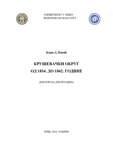 The subject of the doctoral dissertation is the history of the Kruševacdistrict since its formation in 1834, as part of the administrative changes inthe then Principality of Serbia, with a necessary reference to theannexation of the Kruševac region to the Principality of Serbia in 1832–1833 year and the events that led to it. The chronological limit of the workends with the ousting of Prince Mihailо Obrenović from power in 1842,when the entire administration in the Principality of Serbia, and thereforealso in the Kruševac district, changed. The doctoral dissertation presentsan account of the political, cultural, social, religious, economic,educational, demographic and other circumstances in the Kruševac districtin the mentioned chronological boundaries, based on unpublished archivalmaterial from the State Archives of Serbia, the Historical Archive inKruševac, published sources and literature. After the annexation of theKruševac nahija, a new administrative organization was started in thePrincipality of Serbia, and in 1834, the nahija became districts, and thecaptaincy became counties. The chronological framework is related to thistype of administrative division. The Kruševac district played an importantrole in the Principality of Serbia, because as a border region it wasexposed to constant attacks by the Turks and Arbanas, and at the sametime its construction and introduction into the official streams of thePrincipality of Serbia began, which is shown in the paper. The structure ofthe work, in addition to the content, preface, introduction, conclusion andlist of bibliographic units, also consists of 14 thematic chapters. The papercontains 64 tables and one chart.